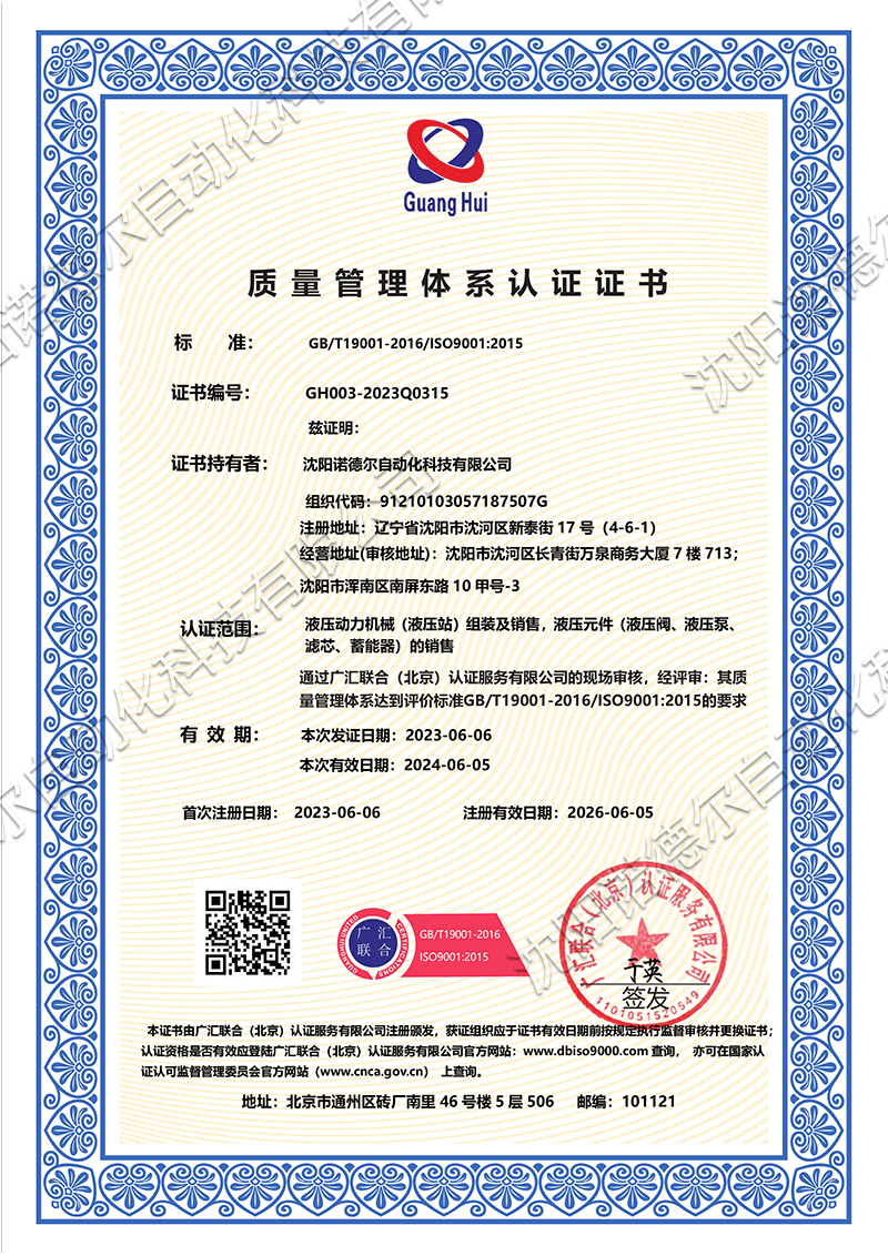 沈陽諾德爾ISO9001質(zhì)量管理體系認(rèn)證證書
